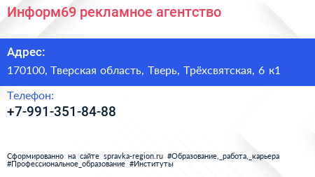 Информ69, рекламное агентство по адресу 170100, Тверская область, Тверь, Трёхсвятская, 6 к1 в дальнейшем Организация, размещена в следующих категориях: