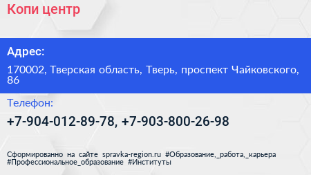 Копи-центр по адресу 170002, Тверская область, Тверь, проспект Чайковского, 86 в дальнейшем Организация, размещена в следующих категориях:
