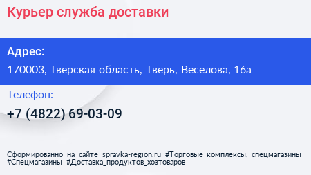 Курьер, служба доставки по адресу 170003, Тверская область, Тверь, Веселова, 16а в дальнейшем Организация, размещена в следующих категориях: