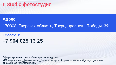 L-Studio, фотостудия по адресу 170008, Тверская область, Тверь, проспект Победы, 39 в дальнейшем Организация, размещена в следующих категориях: