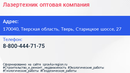 Лазертехник, оптовая компания по адресу 170040, Тверская область, Тверь, Старицкое шоссе, 27 в дальнейшем Организация, размещена в следующих категориях: