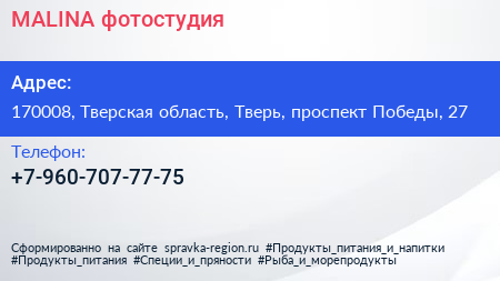MALINA, фотостудия по адресу 170008, Тверская область, Тверь, проспект Победы, 27 в дальнейшем Организация, размещена в следующих категориях: