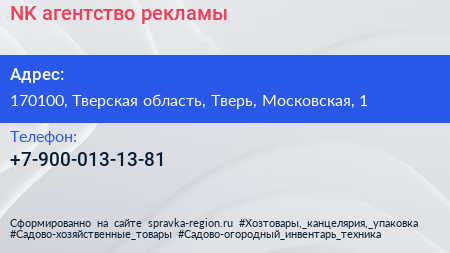 NK, агентство рекламы по адресу 170100, Тверская область, Тверь, Московская, 1 в дальнейшем Организация, размещена в следующих категориях: