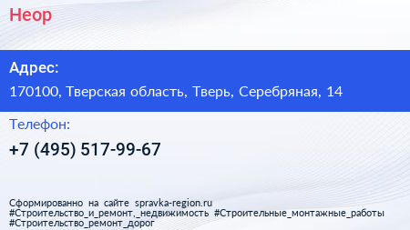 Неор по адресу 170100, Тверская область, Тверь, Серебряная, 14 в дальнейшем Организация, размещена в следующих категориях: