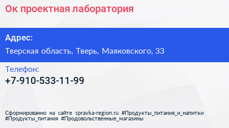 Ок, проектная лаборатория по адресу Тверская область, Тверь, Маяковского, 33 в дальнейшем Организация, размещена в следующих категориях: