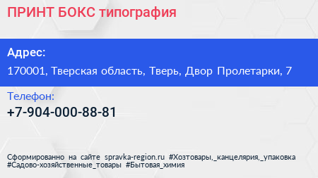 ПРИНТ БОКС, типография по адресу 170001, Тверская область, Тверь, Двор Пролетарки, 7 в дальнейшем Организация, размещена в следующих категориях: