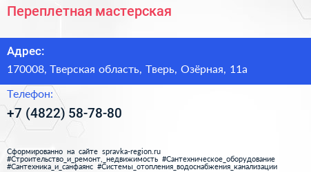 Переплетная мастерская по адресу 170008, Тверская область, Тверь, Озёрная, 11а в дальнейшем Организация, размещена в следующих категориях:
