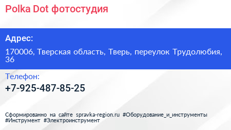 Polka Dot, фотостудия по адресу 170006, Тверская область, Тверь, переулок Трудолюбия, 36 в дальнейшем Организация, размещена в следующих категориях: