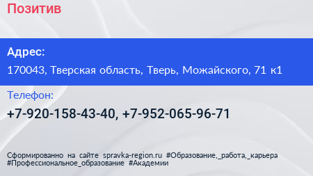 Позитив+ по адресу 170043, Тверская область, Тверь, Можайского, 71 к1 в дальнейшем Организация, размещена в следующих категориях: