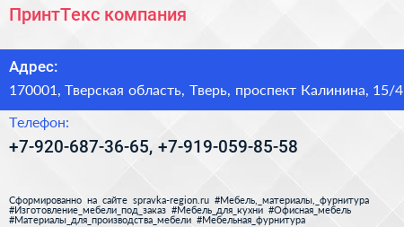 ПринтТекс, компания по адресу 170001, Тверская область, Тверь, проспект Калинина, 15/4 в дальнейшем Организация, размещена в следующих категориях: