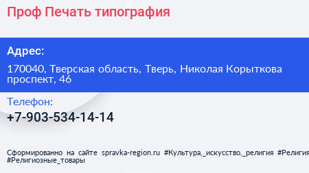Проф Печать, типография по адресу 170040, Тверская область, Тверь, Николая Корыткова проспект, 46 в дальнейшем Организация, размещена в следующих категориях: