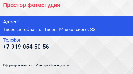 Простор, фотостудия по адресу Тверская область, Тверь, Маяковского, 33 в дальнейшем Организация, размещена в следующих категориях: