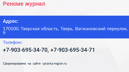 Реноме, журнал по адресу 170100, Тверская область, Тверь, Вагжановский переулок, 9 в дальнейшем Организация, размещена в следующих категориях: