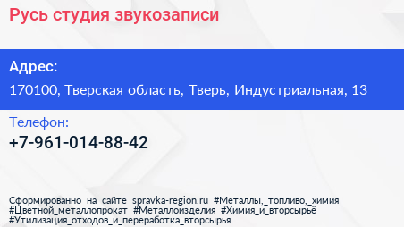 Русь, студия звукозаписи по адресу 170100, Тверская область, Тверь, Индустриальная, 13 в дальнейшем Организация, размещена в следующих категориях:
