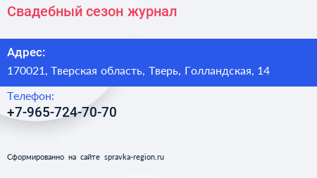 Свадебный сезон, журнал по адресу 170021, Тверская область, Тверь, Голландская, 14 в дальнейшем Организация, размещена в следующих категориях: