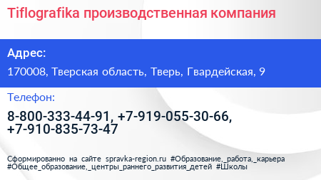 Tiflografika, производственная компания по адресу 170008, Тверская область, Тверь, Гвардейская, 9 в дальнейшем Организация, размещена в следующих категориях: