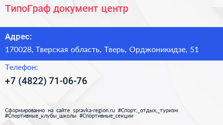 ТипоГраф, документ-центр по адресу 170028, Тверская область, Тверь, Орджоникидзе, 51 в дальнейшем Организация, размещена в следующих категориях: