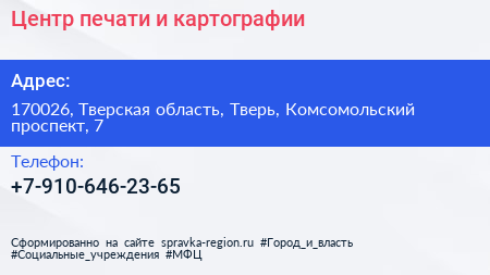 Центр печати и картографии по адресу 170026, Тверская область, Тверь, Комсомольский проспект, 7 в дальнейшем Организация, размещена в следующих категориях: