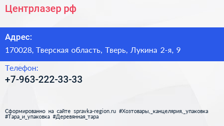 Центрлазер.рф по адресу 170028, Тверская область, Тверь, Лукина 2-я, 9 в дальнейшем Организация, размещена в следующих категориях: