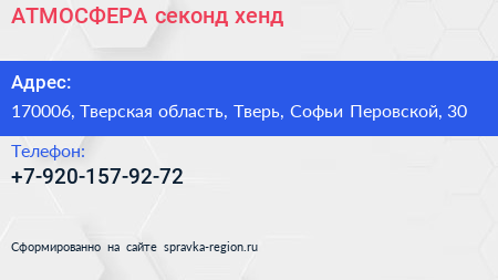 АТМОСФЕРА, секонд-хенд по адресу 170006, Тверская область, Тверь, Софьи Перовской, 30 в дальнейшем Организация, размещена в следующих категориях: