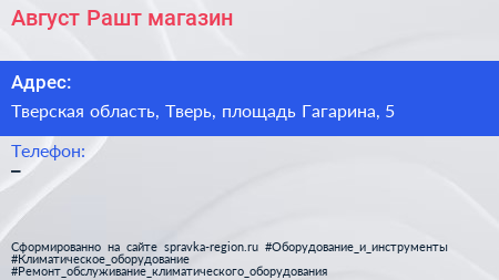 Август-Рашт, магазин по адресу Тверская область, Тверь, площадь Гагарина, 5 в дальнейшем Организация, размещена в следующих категориях: