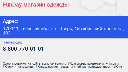 FunDay, магазин одежды по адресу 170043, Тверская область, Тверь, Октябрьский проспект, 103 в дальнейшем Организация, размещена в следующих категориях: