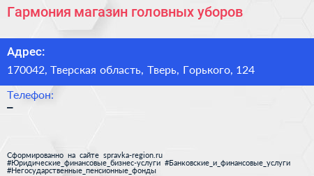 Гармония, магазин головных уборов по адресу 170042, Тверская область, Тверь, Горького, 124 в дальнейшем Организация, размещена в следующих категориях: