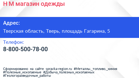 H & M, магазин одежды по адресу Тверская область, Тверь, площадь Гагарина, 5 в дальнейшем Организация, размещена в следующих категориях: