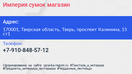 Империя сумок, магазин по адресу 170001, Тверская область, Тверь, проспект Калинина, 15 ст1 в дальнейшем Организация, размещена в следующих категориях: