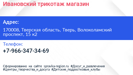 Ивановский трикотаж, магазин по адресу 170008, Тверская область, Тверь, Волоколамский проспект, 15 к2 в дальнейшем Организация, размещена в следующих категориях: