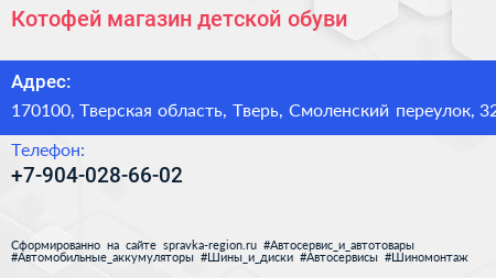 Котофей, магазин детской обуви по адресу 170100, Тверская область, Тверь, Смоленский переулок, 32 в дальнейшем Организация, размещена в следующих категориях: