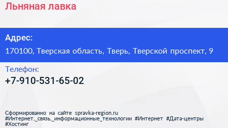 Льняная лавка по адресу 170100, Тверская область, Тверь, Тверской проспект, 9 в дальнейшем Организация, размещена в следующих категориях: