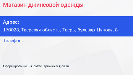 Магазин джинсовой одежды по адресу 170028, Тверская область, Тверь, бульвар Цанова, 8 в дальнейшем Организация, размещена в следующих категориях: