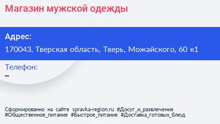 Магазин мужской одежды по адресу 170043, Тверская область, Тверь, Можайского, 60 к1 в дальнейшем Организация, размещена в следующих категориях: