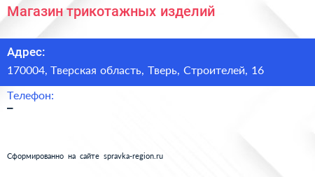 Магазин трикотажных изделий по адресу 170004, Тверская область, Тверь, Строителей, 16 в дальнейшем Организация, размещена в следующих категориях: