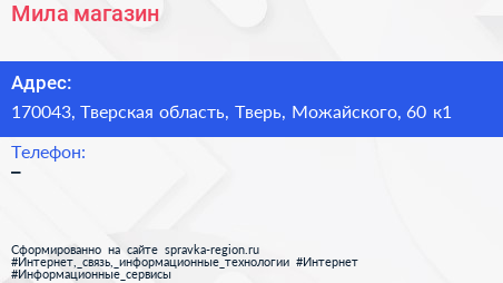 Мила, магазин по адресу 170043, Тверская область, Тверь, Можайского, 60 к1 в дальнейшем Организация, размещена в следующих категориях:
