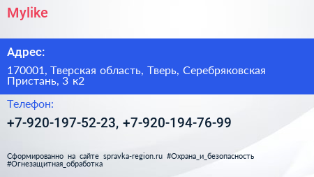 Mylike по адресу 170001, Тверская область, Тверь, Серебряковская Пристань, 3 к2 в дальнейшем Организация, размещена в следующих категориях: