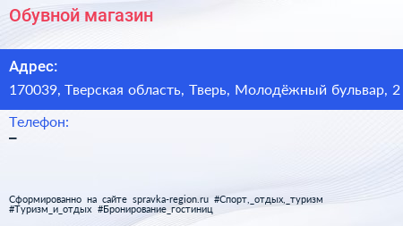 Обувной магазин по адресу 170039, Тверская область, Тверь, Молодёжный бульвар, 2 в дальнейшем Организация, размещена в следующих категориях: