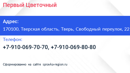 Первый Цветочный по адресу 170100, Тверская область, Тверь, Свободный переулок, 22 в дальнейшем Организация, размещена в следующих категориях:
