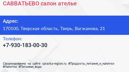 САВВАТЬЕВО, салон-ателье по адресу 170100, Тверская область, Тверь, Вагжанова, 21 в дальнейшем Организация, размещена в следующих категориях: