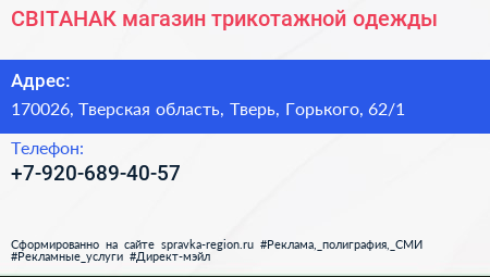 СВIТАНАК, магазин трикотажной одежды по адресу 170026, Тверская область, Тверь, Горького, 62/1 в дальнейшем Организация, размещена в следующих категориях: