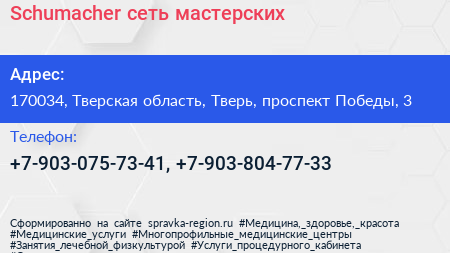 Schumacher, сеть мастерских по адресу 170034, Тверская область, Тверь, проспект Победы, 3 в дальнейшем Организация, размещена в следующих категориях: