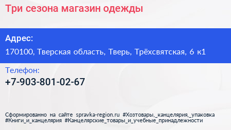 Три сезона, магазин одежды по адресу 170100, Тверская область, Тверь, Трёхсвятская, 6 к1 в дальнейшем Организация, размещена в следующих категориях: