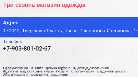 Три сезона, магазин одежды по адресу 170042, Тверская область, Тверь, Скворцова-Степанова, 15 в дальнейшем Организация, размещена в следующих категориях: