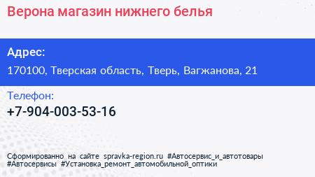 Верона, магазин нижнего белья по адресу 170100, Тверская область, Тверь, Вагжанова, 21 в дальнейшем Организация, размещена в следующих категориях: