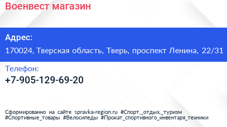 Военвест, магазин по адресу 170024, Тверская область, Тверь, проспект Ленина, 22/31 в дальнейшем Организация, размещена в следующих категориях: