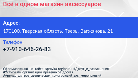 Всё в одном, магазин аксессуаров по адресу 170100, Тверская область, Тверь, Вагжанова, 21 в дальнейшем Организация, размещена в следующих категориях: