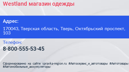 Westland, магазин одежды по адресу 170043, Тверская область, Тверь, Октябрьский проспект, 103 в дальнейшем Организация, размещена в следующих категориях: