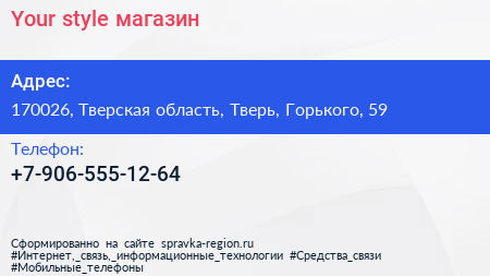 Your style, магазин по адресу 170026, Тверская область, Тверь, Горького, 59 в дальнейшем Организация, размещена в следующих категориях: