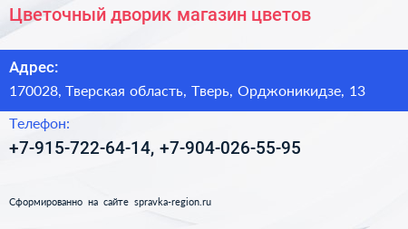 Цветочный дворик, магазин цветов по адресу 170028, Тверская область, Тверь, Орджоникидзе, 13 в дальнейшем Организация, размещена в следующих категориях: